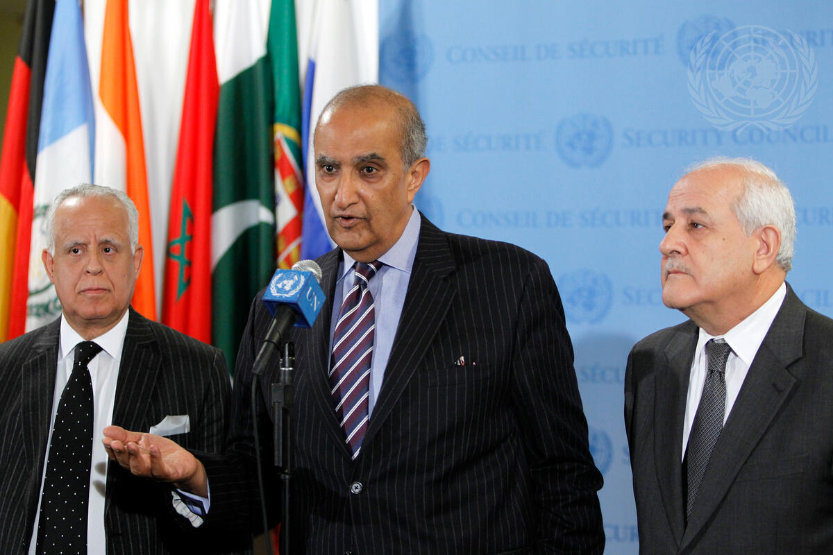 Maged A. Abdelaziz (centre), Permanent Representative of Egypt to the UN, speaks to the press following the Security Council’s closed-door consultations on the situation in Israel and the Palestinian territories, at which Members were briefed on the impact of ongoing Israeli settlement activity. Mr. Abdelaziz is flanked by Riyad H. Mansour (right), Permanent Observer of Palestine to the UN, and Mohammed Loulichki, Morocco’s Permanent Representative to the UN.
