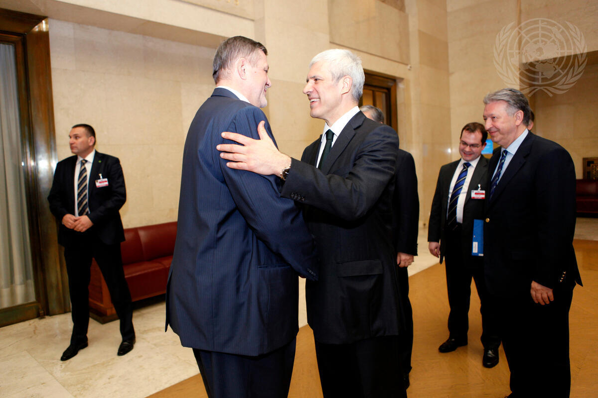 Jan Kubis (front, left), Executive Secretary of the UN Economic Commission for Europe (UNECE), greets Serbian President Boris Tadic as he arrives for a visit at the UN’s headquarters in Geneva, Switzerland.