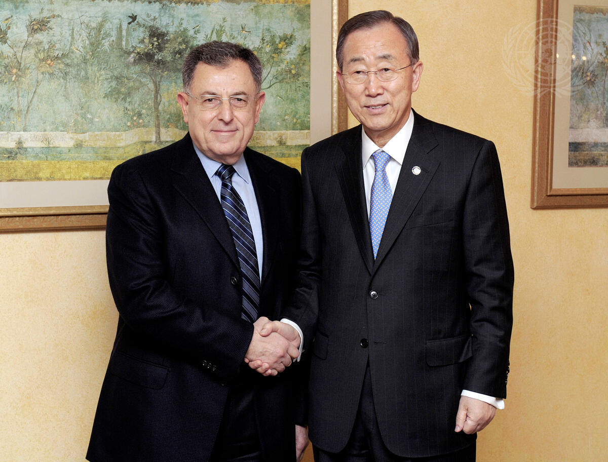 Secretary-General Ban Ki-moon (right) meets with Fouad Siniora, Leader of the Lebanon First Bloc in Parliament and former Prime Minister of Lebanon, in Beirut.