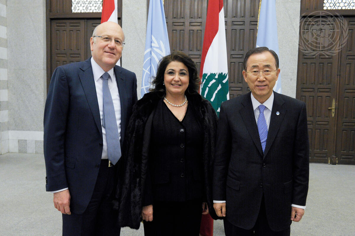 Secretary-General Ban Ki-moon (right) meets with Najib Mikati (left), Prime Minister of Lebanon, and his wife, May, at an official dinner hosted by Mr. Mikati in honour of the participants of the High-Level Meeting on Reform and Transitions to Democracy, in Beirut.