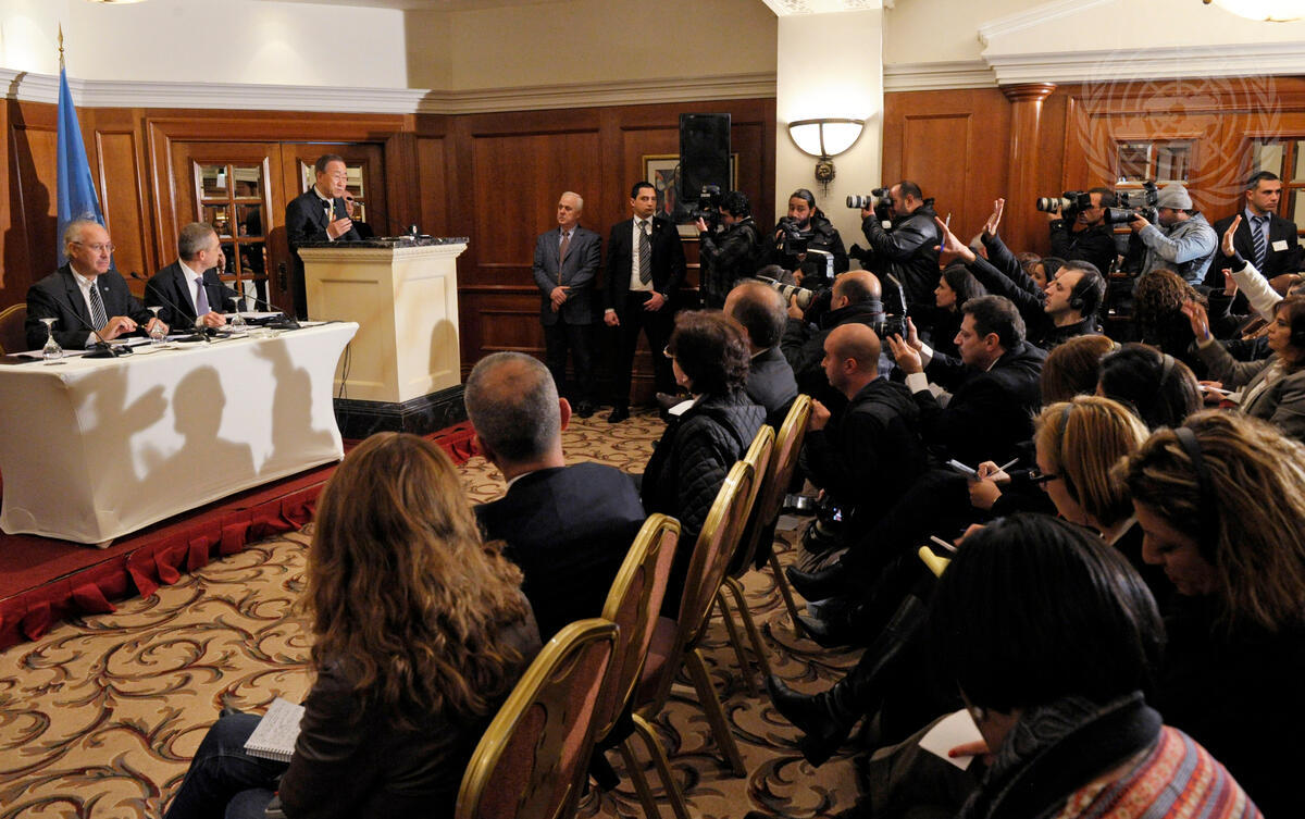 Secretary-General Ban Ki-moon (at podium, right) briefs the press during his official visit to Beirut, Lebanon.