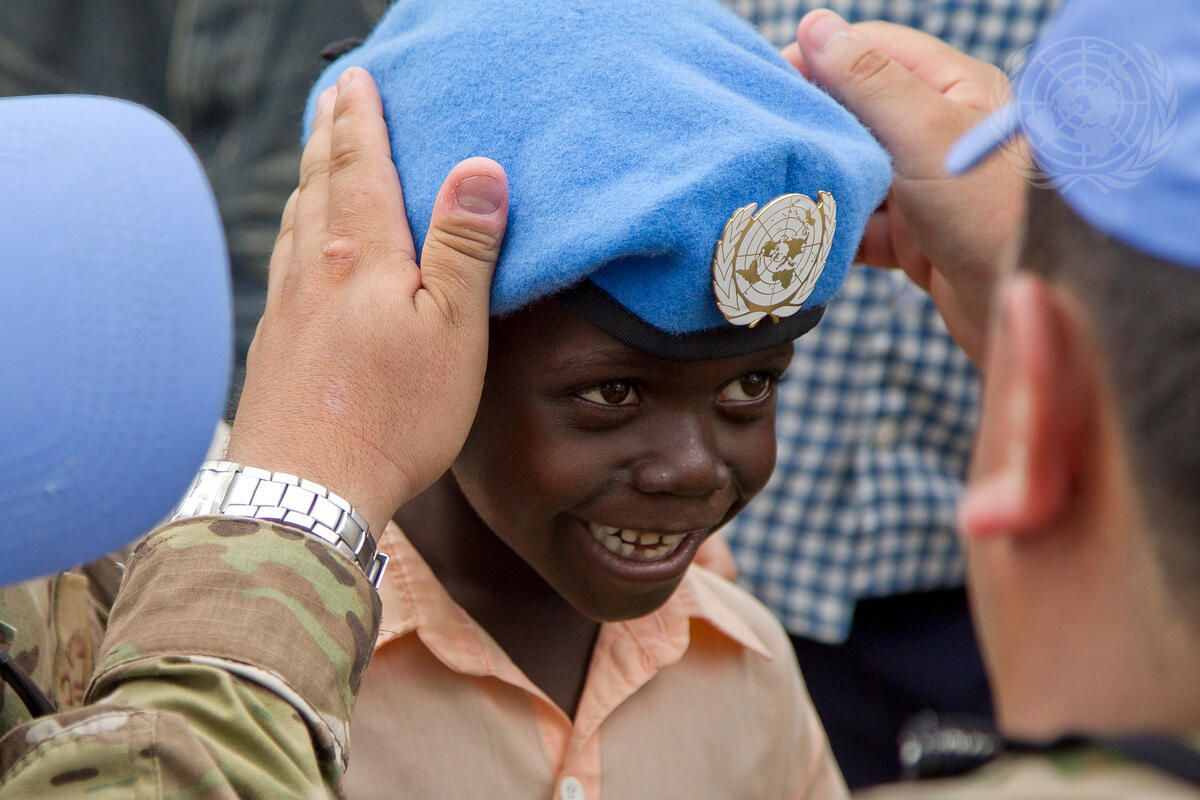 Pictured: a MINUSTAH peacekeeper fits one of the children with a blue beret.