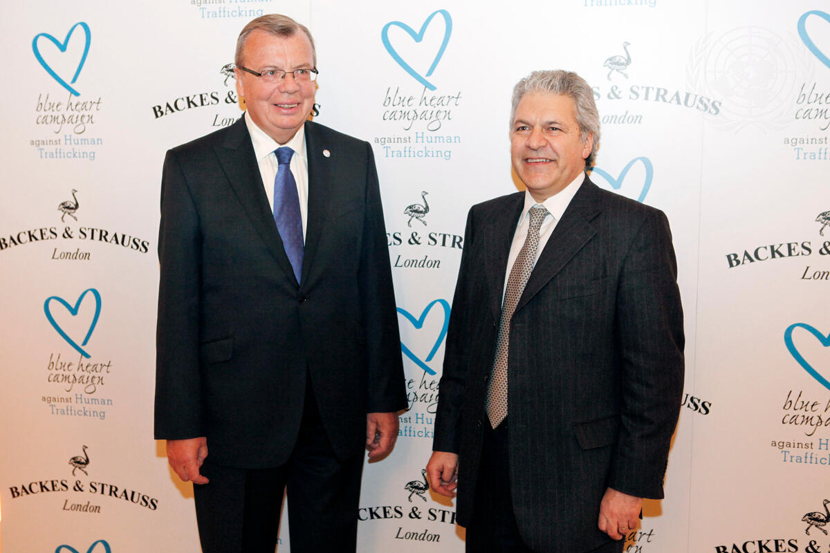 Yury Fedotov (left), Executive Director of the UN Office on Drugs and Crime (UNODC), and Vartkess Knadjian, Chief Executive Officer of jewellery company Backes & Strauss, attend the launch of a special watch by the company that will benefit the UN Blue Heart Campaign against Human Trafficking.