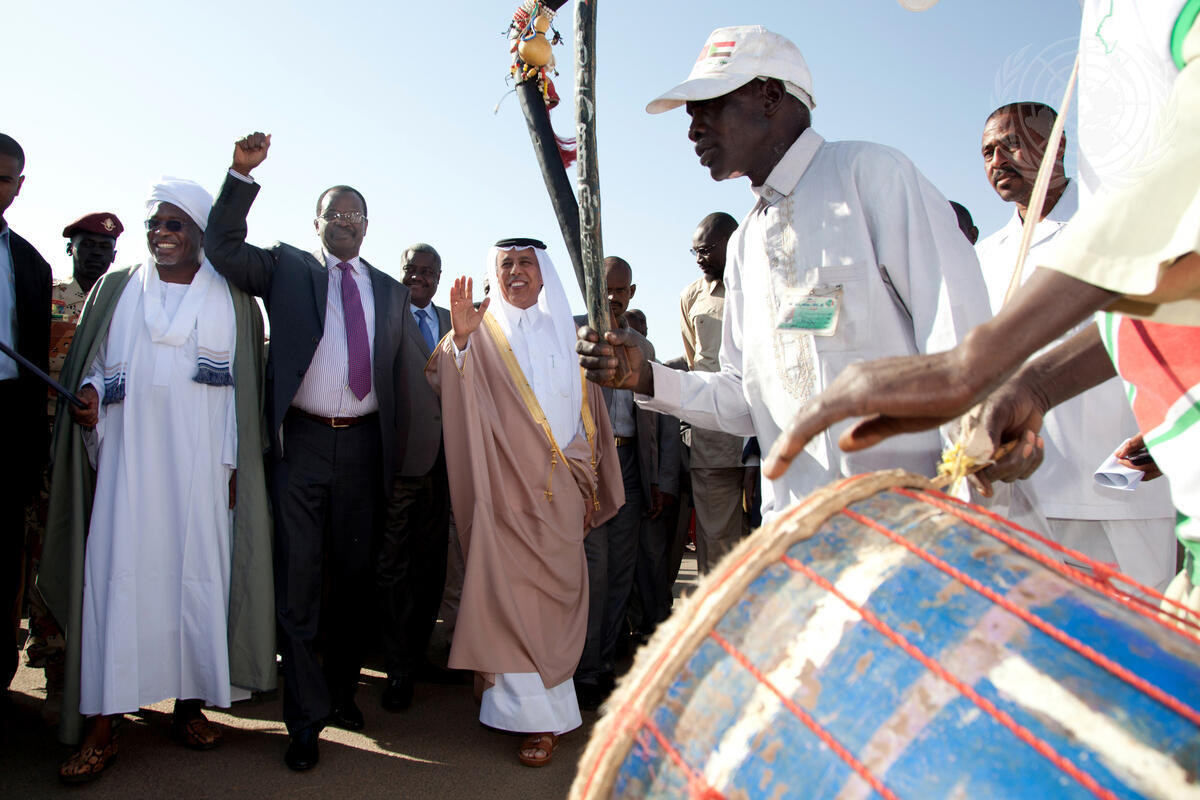 Pictured (front, from left): Osman Yousif Kibir, Wali of North Darfur ; Eltigani Seisi, Leader of the Liberation and Justice Movement (LJM); and Ahmed bin Abdullah Al Mahmoud, Qatari Minister of State for Cabinet Affairs; are given a welcome ceremony as they arrive at the airport in El Fasher, in North Darfur, Sudan. The officials travelled to El Fasher to attend the second meeting of the Implementation Follow-Up Commission on the Doha Document for Peace in Darfur (DDPD), chaired by the Government of Qatar.