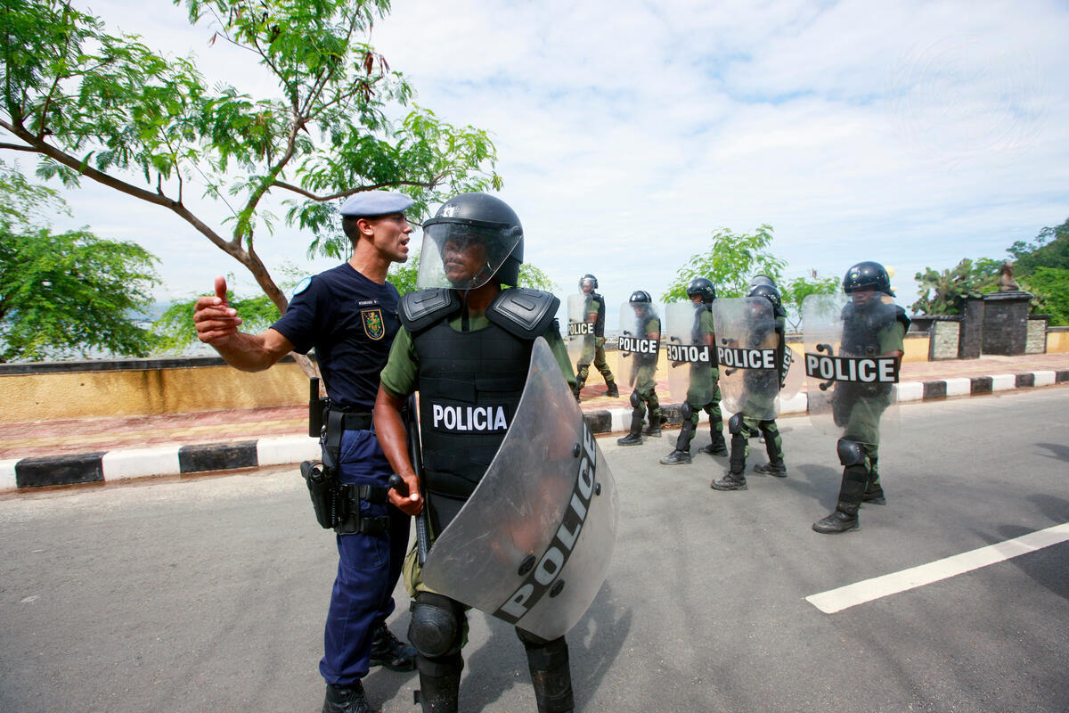 A member of the Portuguese Formed Police Unit (FPU), at left, with the UN Integrated Mission in Timor-Leste (UNMIT), leads the Timorese Police’s special company officers in a public order training exercise, in Dili, Timor-Leste.