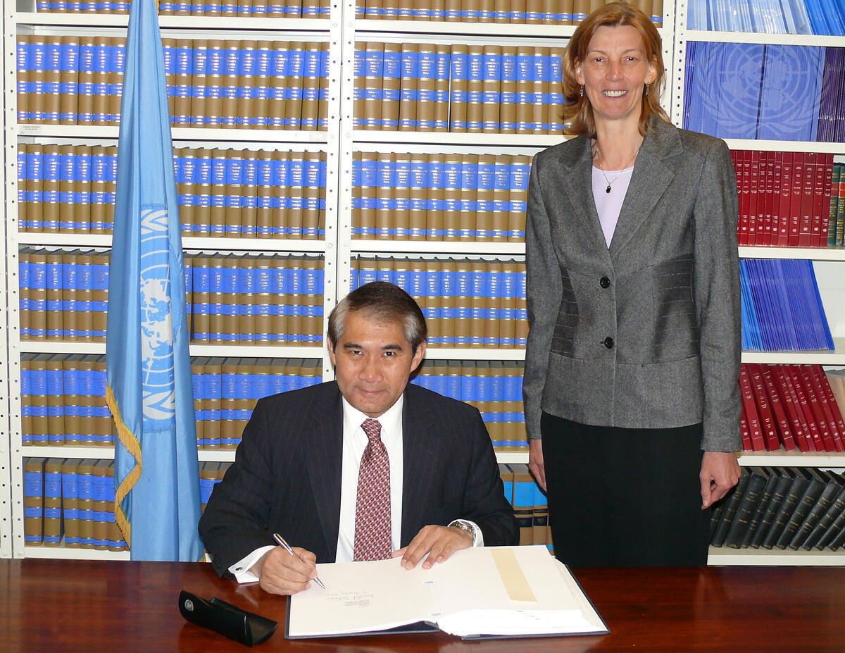 Norachit Sinhaseni (seated), Permanent Representative of Thailand to the UN, signs the International Convention for the Protection of all Persons from Enforced Disappearance. Beside him is Gabriele Goettsche-Wanli, Chief of the Treaty Section in the UN Office of Legal Affairs.