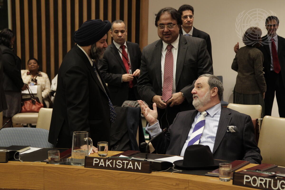 Abdullah Hussain Haroon (seated right), Permanent Representative of Pakistan to the UN, chats with Manjeev Singh Puri (front, left), Deputy Permanent Representative of India to the UN, before a meeting of the Security Council. The Council discussed strengthening the relationship between the United Nations and regional organizations, in particular the African Union, in the maintenance of international peace and security.