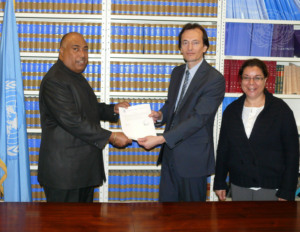 Collin D. Beck (left), Permanent Representative of the Solomon Islands to the UN, poses for a photo with Andrei Kolomoets (centre), Officer-in-Charge of the Treaty Section in the UN Office of Legal Affairs, and Dina Hamdy, Legal Officer, after depositing an instrument of accession to the United Nations Convention against Corruption.