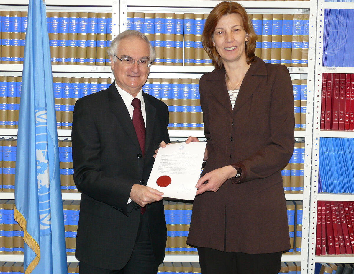Saviour F. Borg (left), Permanent Representative of Malta to the UN, poses for a photo with Gabriele Goettsche-Wanli, Chief of the Treaty Section in the UN Office of Legal Affairs, after ratifying, on behalf of his Government, the Amendment to the Basel Convention on the Control of Transboundary Movements of Hazardous Wastes and their Disposal.