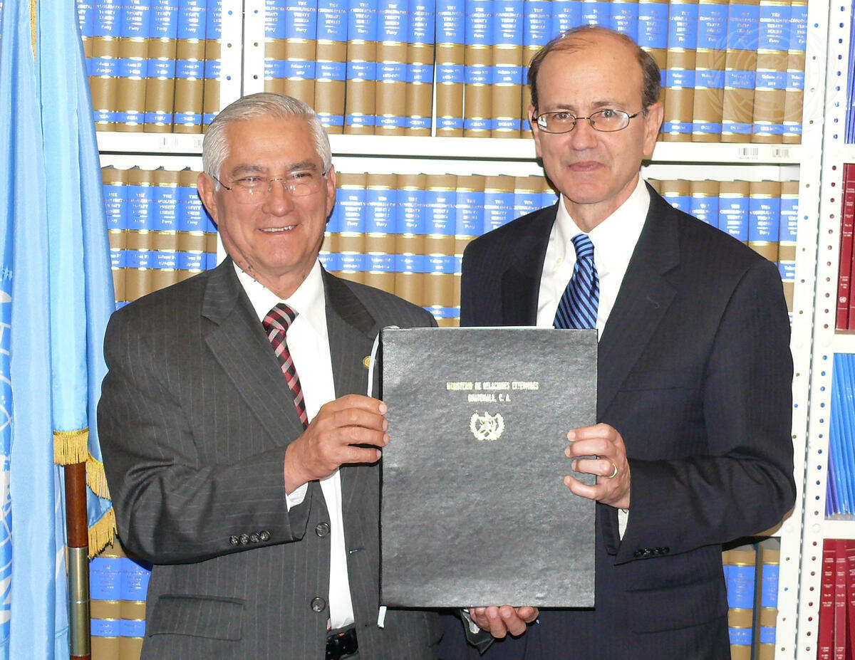 Roger Haroldo Rodas Melgar (left), Minister for Foreign Affairs of Guatemala, poses for a photo with Stephen Mathias, Assistant Secretary-General for Legal Affairs, after depositing an instrument of ratification to the Comprehensive Nuclear-Test-Ban Treaty.