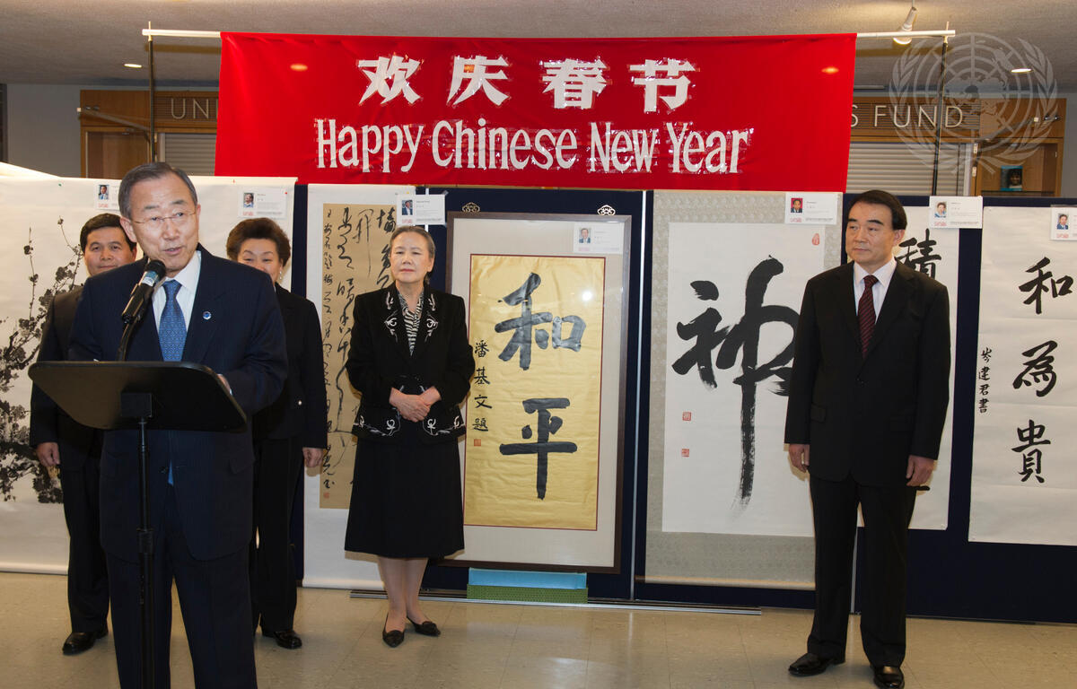 Secretary-General Ban Ki-moon (left, at lectern) speaks at the opening of a Chinese traditional calligraphy exhibit at UN Headquarters, sponsored by the Permanent Mission of China to the UN and organized in anticipation of the Chinese New Year (23 January). Pictured with Mr. Ban are his wife, Yoo Soon-taek (second from right), and Li Baodong (right), Permanent Representative of China to the UN.