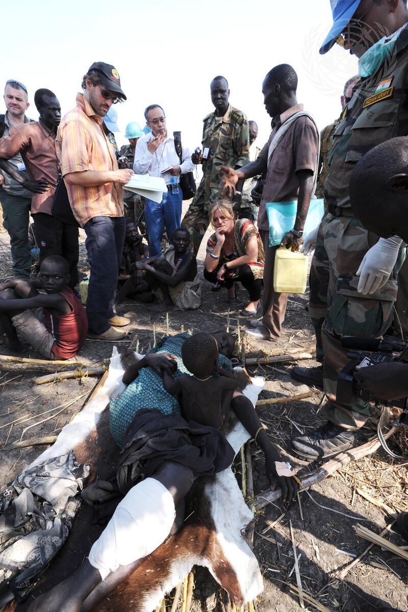 Hilde Johnson (crouching, centre), Special Representative of the Secretary-General for South Sudan and Head of the UN mission in that country (UNMISS), accompanies the mission’s Indian medical staff as they attend to residents of Fertait, a village in Jonglei State burned down amid ethnic clashes. The tensions that began late last year over cattle raiding among Jonglei’s Lou Nuer, Murle and other groups, have escalated into a conflict that has displaced at least 60,000 people.
