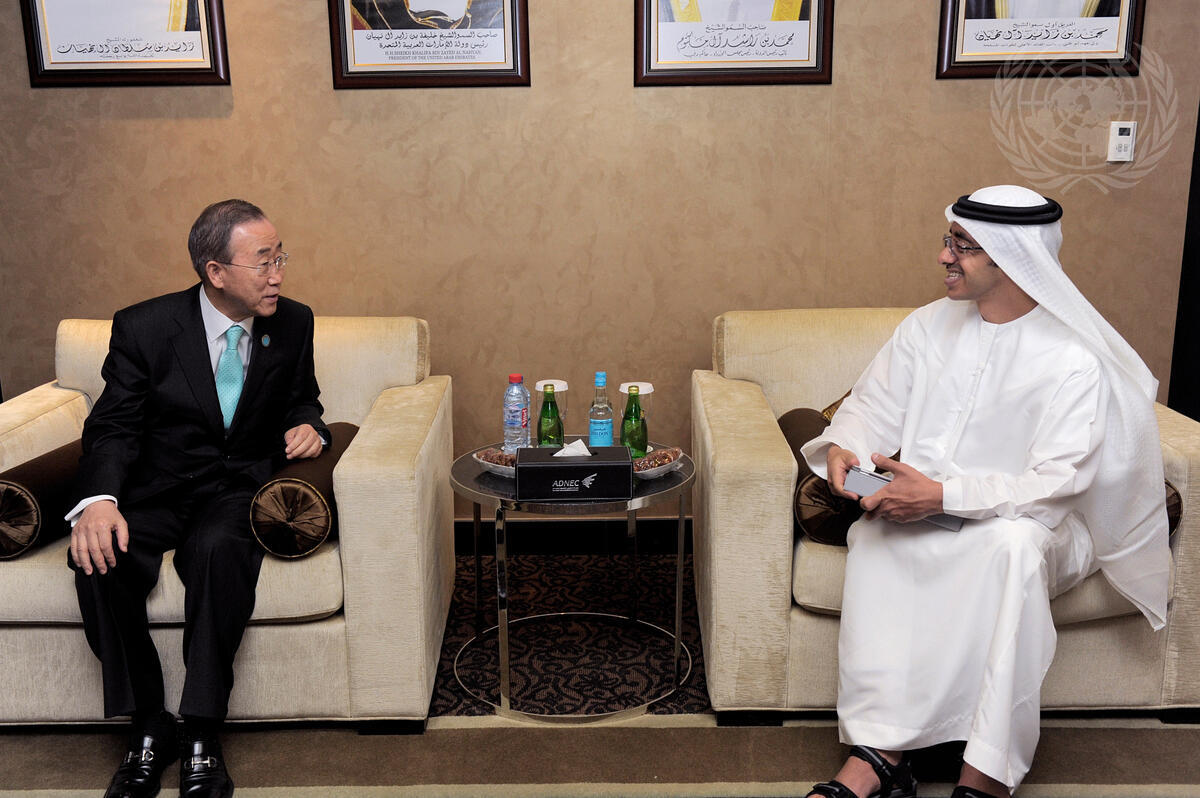 Secretary-General Ban Ki-moon (left) meets with Sheikh Abdullah Bin Zayed Al Nahyan, Minister for Foreign Affairs of the United Arab Emirates (U.A.E.), at the Abu Dhabi National Exhibition Center, where the World Future Energy Summit opens today.