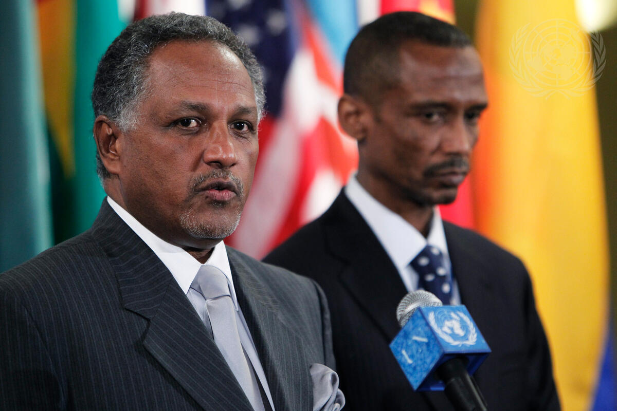 Daffa-Alla Elhag Ali Osman (left), Permanent Representative of Sudan to the UN, speaks to the press following a closed-door session of the Security Council on the situations in Sudan’s Blue Nile and South Kordofan States.