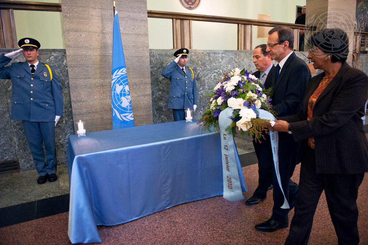 Sergei Ordzhonikidze (second from right), Director-General of the United Nations Office at Geneva (UNOG), and Navi Pillay (right), UN High Commissioner for Human Rights, lay a wreath in memory of the UN staff members who lost their lives in the devastating January 2010 earthquake in Haiti, during a ceremony for the one-year anniversary of the earthquake, at UNOG, Switzerland.