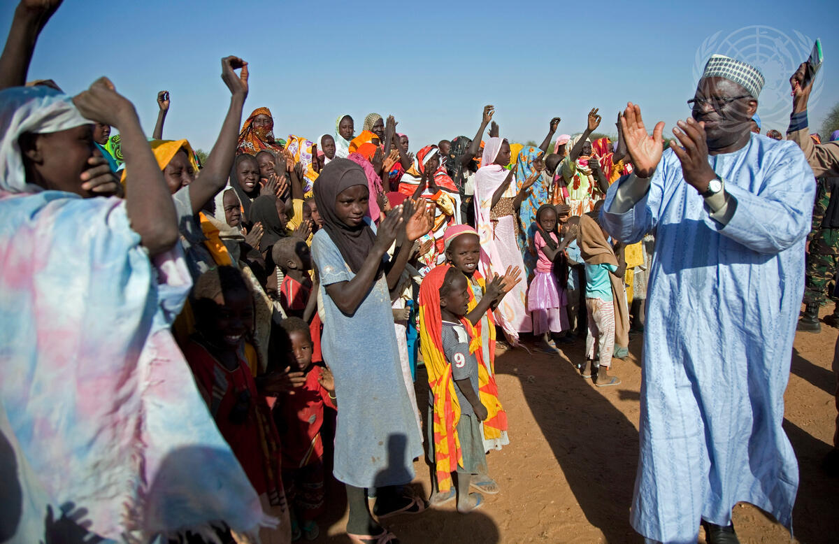Ibrahim Gambari (right), Joint Special Representative for the African Union-United Nations Hybrid Operation in Darfur (UNAMID), meets Sudanese refugees who have settled outside an UNAMID team site in Khor Abeche, South Darfur, since fleeing violence in their native villages last December. UNAMID is providing water and security to the community while urgent humanitarian relief is requested.