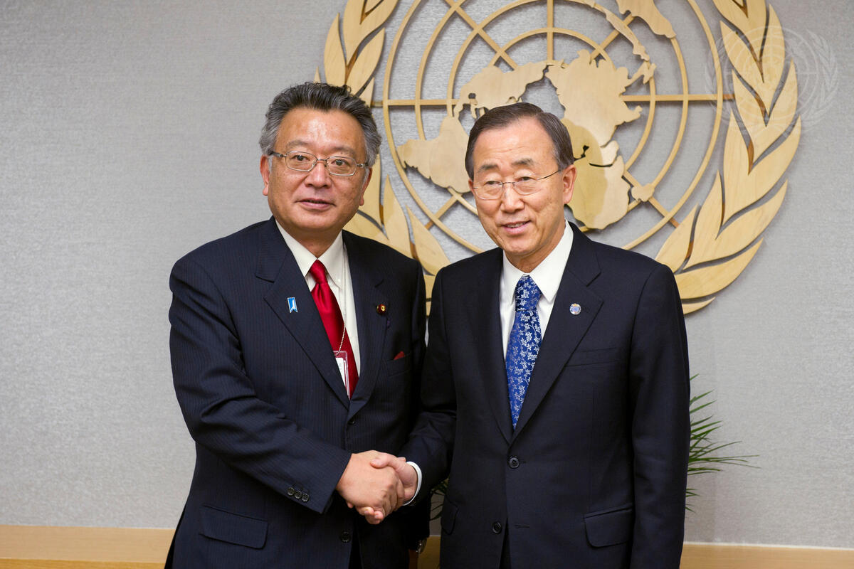 Secretary-General Ban Ki-moon (right) meets with Shozo Azuma, Senior Vice Minister of the Cabinet Office of Japan and Member of Japan’s House of Representatives.