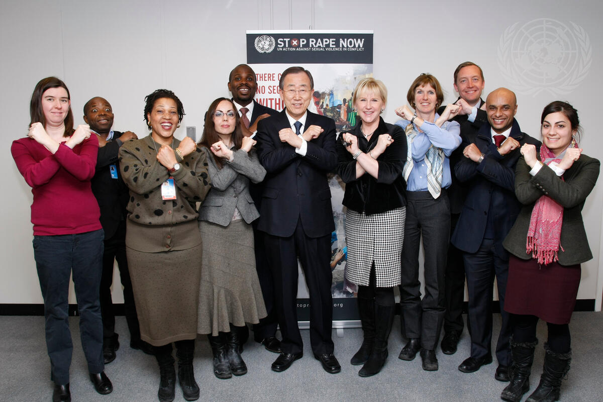 Secretary-General Ban Ki-moon (front, fourth from left) poses for a group photo with Margot Wallström (right of Mr. Ban), his Special Representative on Sexual Violence in Conflict, and Ms. Wallström’s staff members at their offices in New York. They demonstrate the symbol for the “Stop Rape Now” campaign.