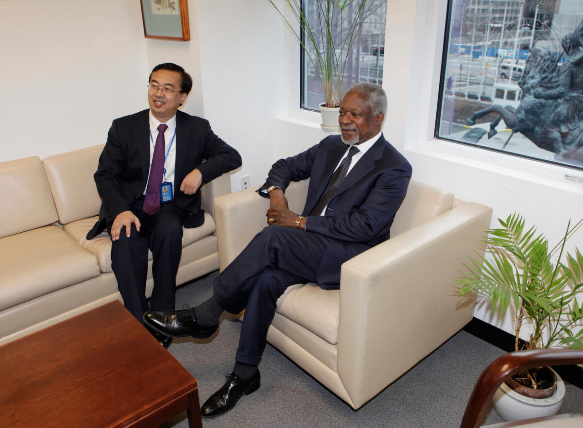 Kofi Annan (right), Joint Special Envoy of the United Nations and the League of Arab States on the Syrian Crisis, meets with Wang Min, Deputy Permanent Representative of China to the UN.