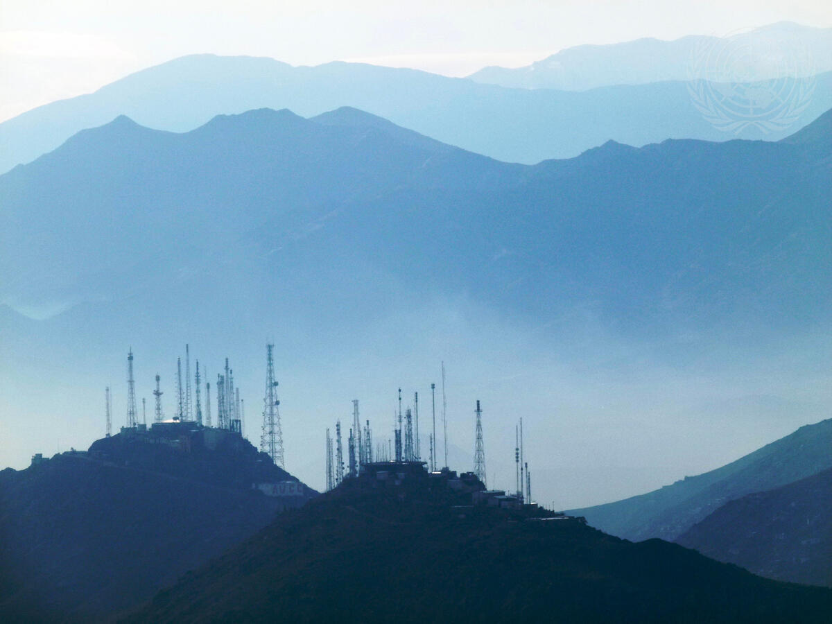 Television broadcast towers line a mountain, nicknamed “TV Mountain”, outside Kabul, Afghanistan.