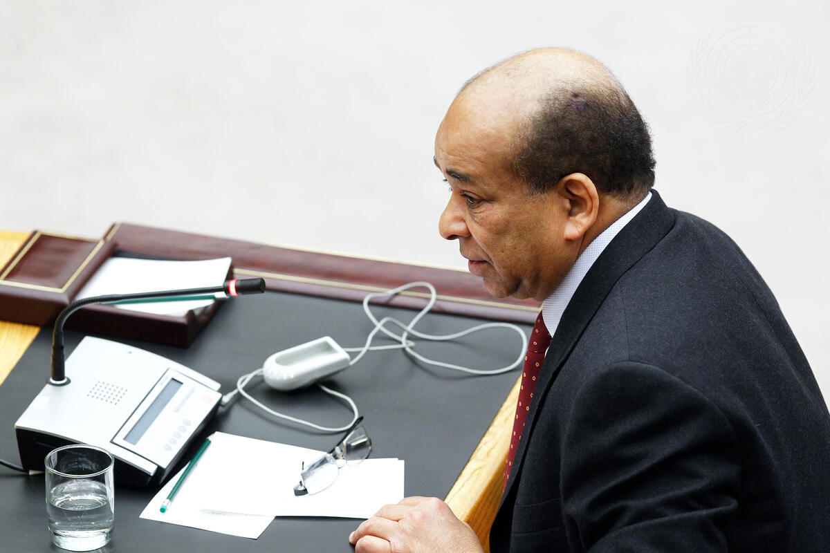 Abdurrahman Mohamed Shalgham, Permanent Representative of Libya to the UN, addresses a meting of the Security Council on the situation in his country.