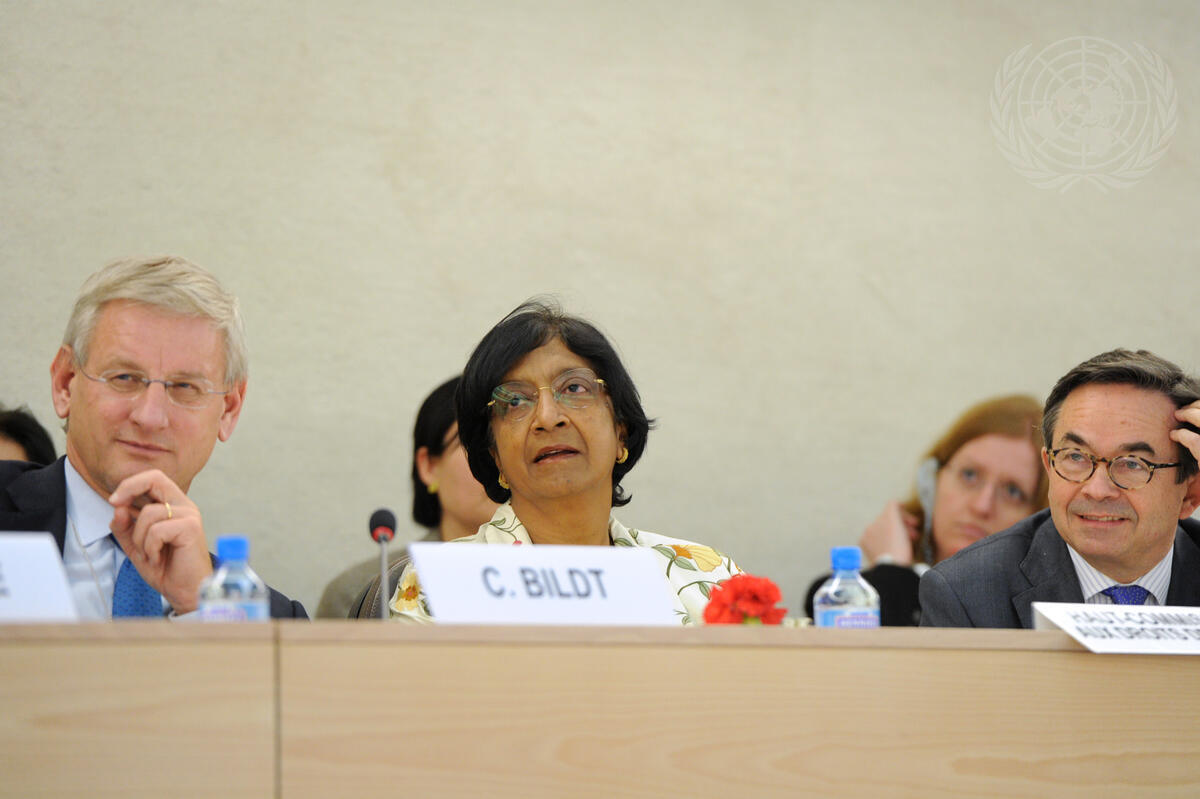 Navi Pillay (centre), UN High Commissioner for Human Rights, and Carl Bildt (left), Minister for Affairs of Sweden, participate in the Human Rights Council panel discussion on the “Promotion and Protection of Freedom of Expression on the Internet”, held as part of the high-level segment of the Council’s 19th session.