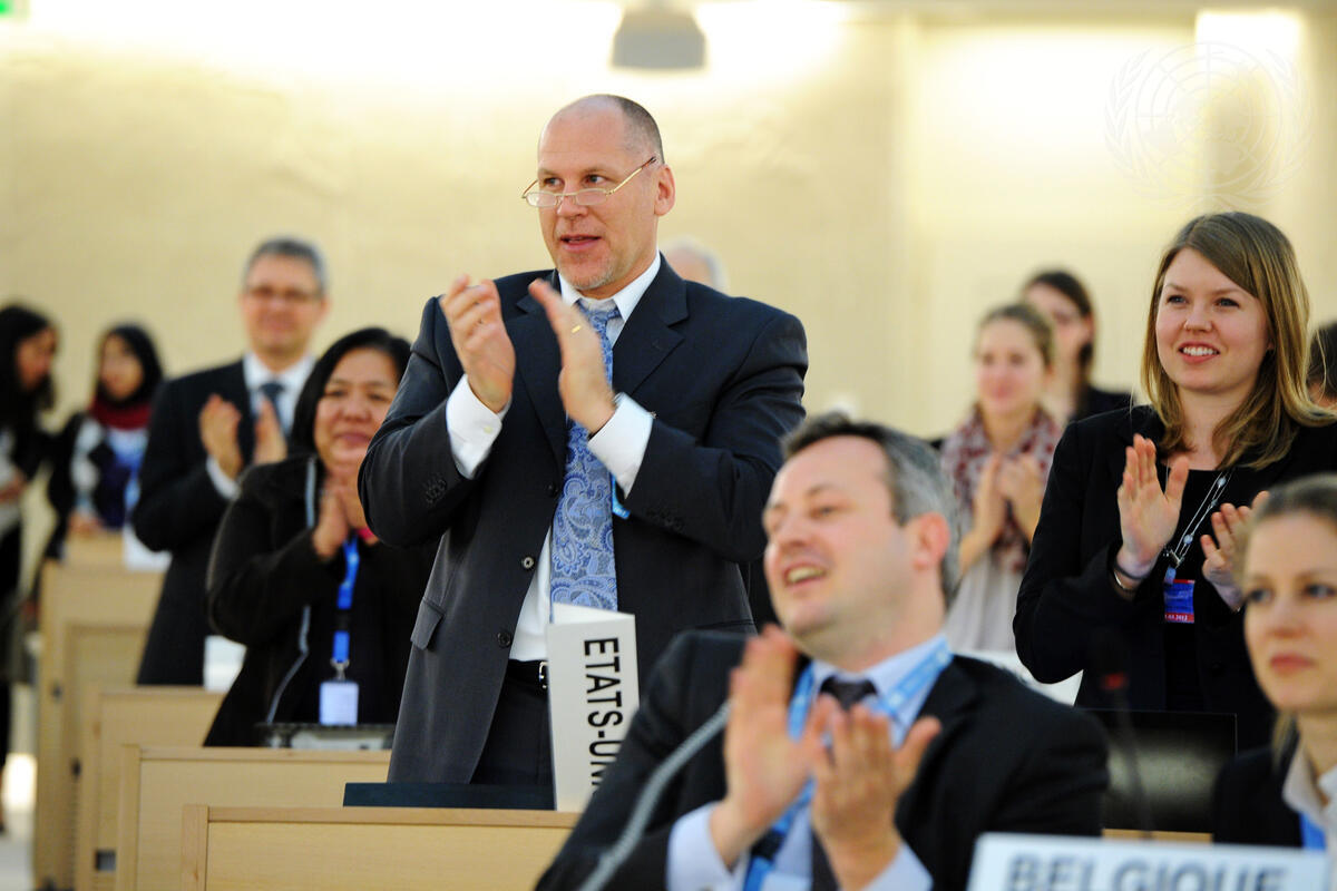 Delegates applaud an address by the deaf rap artist, Signmark, at the Human Rights Council interactive debate on the rights of persons with disabilities. The debate is held as part of the high-level segment of the Council’s 19th session.