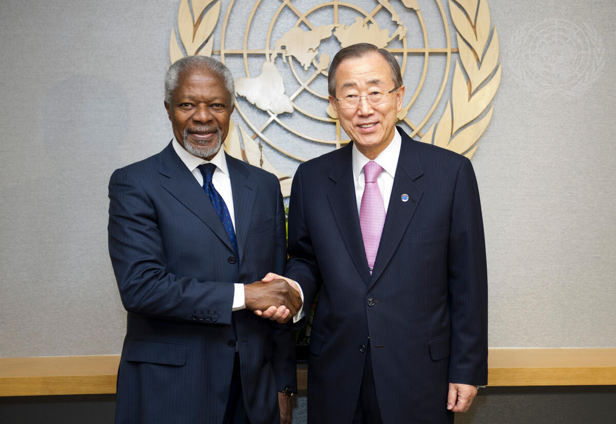 Secretary-General Ban Ki-moon (right) meets with Kofi Annan, former UN Secretary-General and newly-appointed Joint Special Envoy of the UN and League of Arab States on the Syrian Crisis.