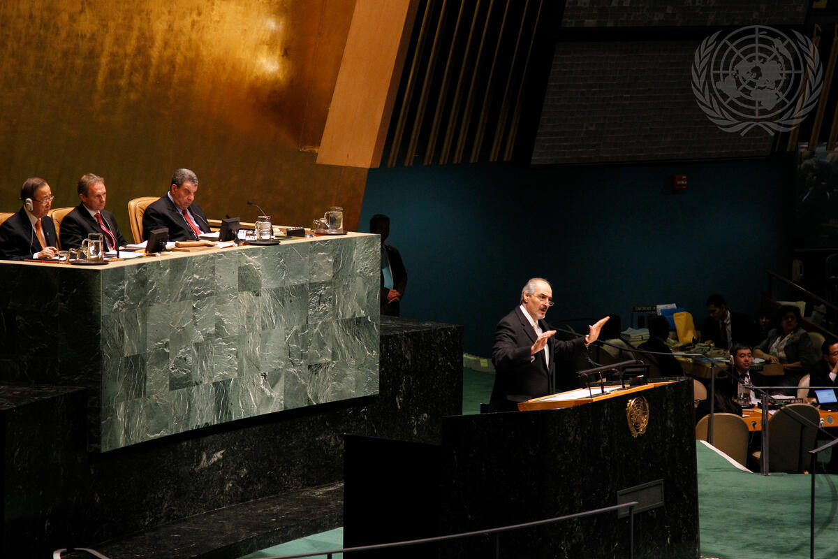 Bashar Ja’afari (right, at podium), Permanent Representative of Syria to the UN, addresses the General Assembly after a report from Secretary-General Ban Ki-moon on the Assembly’s 16 February resolution concerning Syria. The resolution, which requires the Secretary-General to update the Assembly on its implementation, strongly condemns human rights abuses by the Syrian Government and calls for an end to all violence in the country.