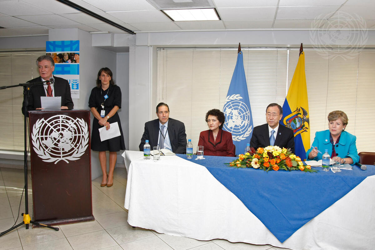 Secretary-General Ban Ki-moon (seated centre) attends a town hall meeting with UN staff members based in Ecuador, at the UN House in Ecuadorean capital, Quito. Mr. Ban is flanked by Alicia Bárcena Ibarra (right), Executive Secretary of the Economic Commission for Latin America and the Caribbean (ECLAC), and Lucia Salamea, Andean Region Director for UNIFEM.