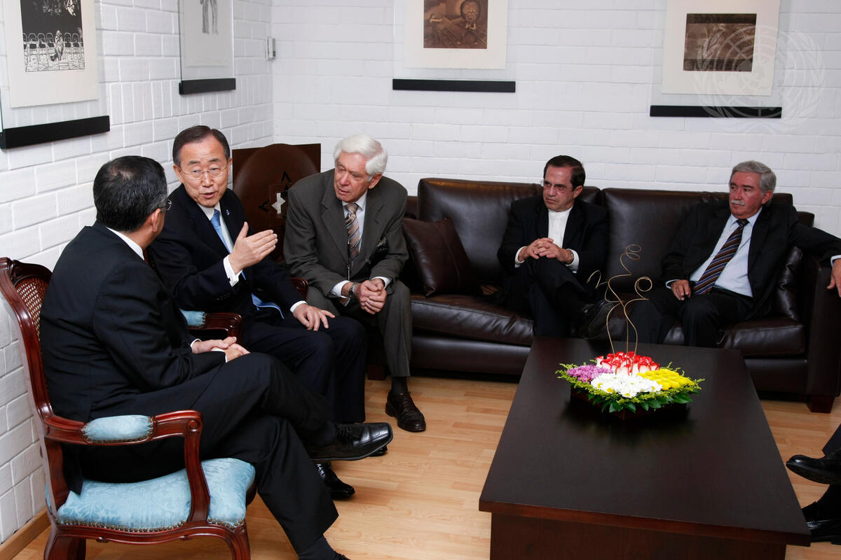 Secretary-General Ban Ki-moon (second from left) meets with Augusto Barrera (left), Mayor of Quito, in Mr. Barrera's office in Quito, Ecuador.