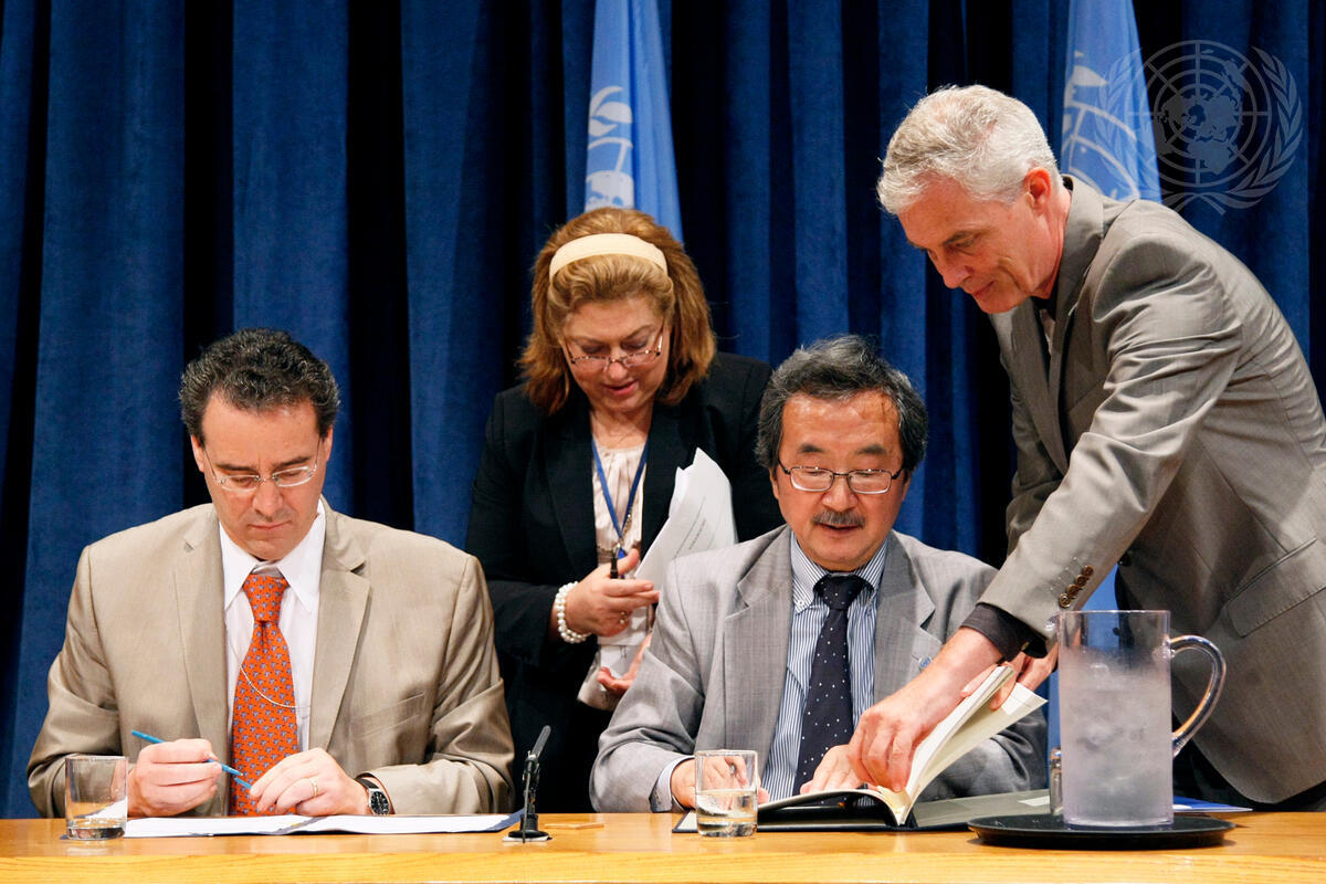 Kiyotaka Akasaka (seated right), Under-Secretary-General for Communications and Public Information, and Miguel Berger (seated left), Deputy Permanent Representative of Germany to the UN, sign a document sealing the partnership between the Department of Public Information and Germany in hosting the upcoming DPI/Non-Governmental Organizations (NGO) Conference in Bonn, Germany.