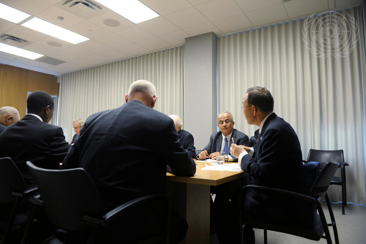 Secretary-General Ban Ki-moon (head of table), alongside his top advisers, holds a videoconference with the heads of major regional organizations, including the African Union, the League of Arab States, the Organisation of Islamic Cooperation, and the European Union, on coordinating assistance to Libya for emergency aid and a democratic transition. Pictured right of Mr. Ban is Abdul Ilah al-Khatib, his Special Envoy for Libya.