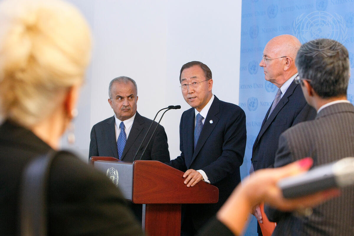 Secretary-General Ban Ki-moon (centre) briefs the press following his videoconference with major regional organizations, such as the African Union and European Union, on providing assistance to Libya for emergency aid and a democratic transition. Mr. Ban is flanked by Abdul Ilah al-Khatib (left), his Special Envoy for Libya, and Ian Martin, Special Adviser for post-conflict planning in Libya.