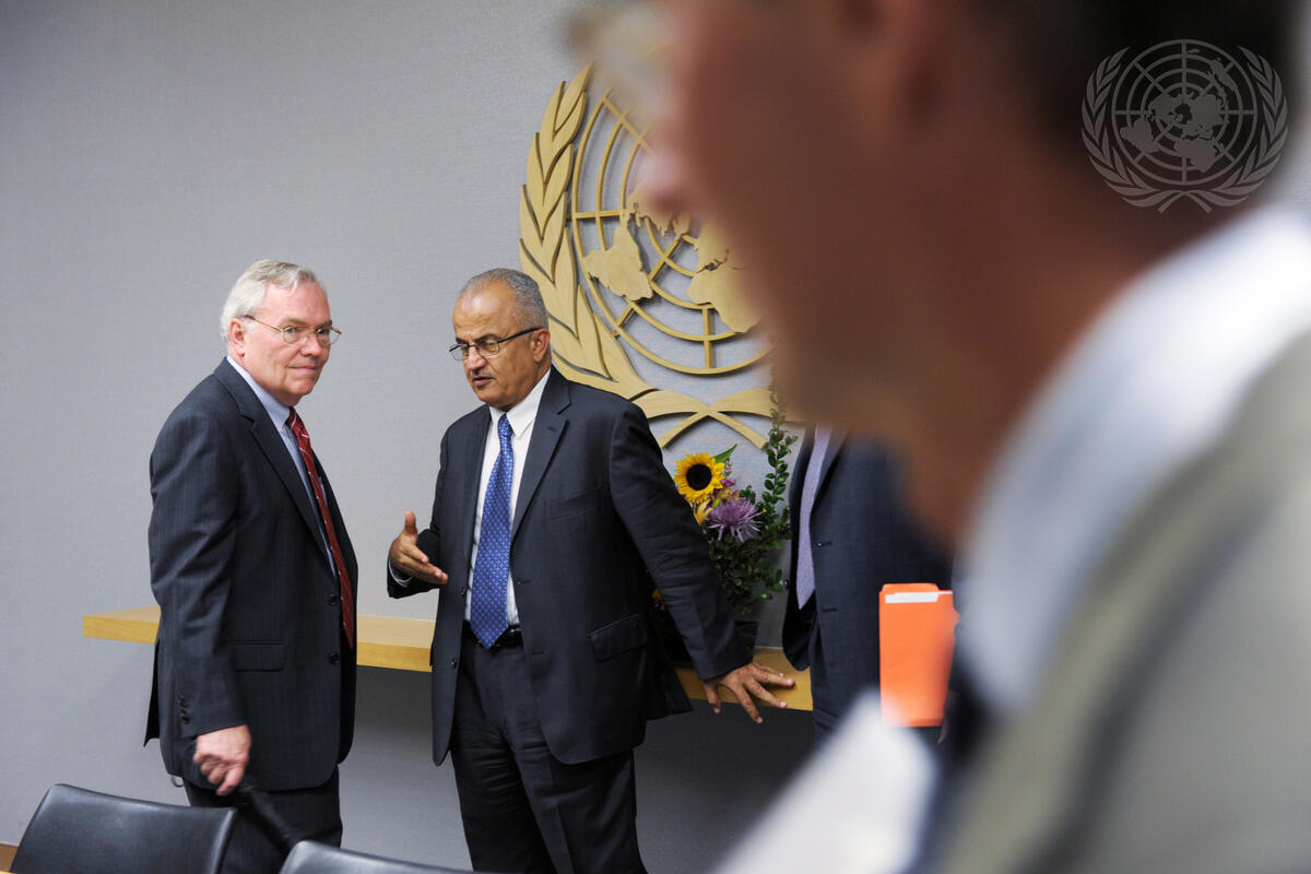 Abdul Ilah al-Khatib (right), Special Envoy of the Secretary-General for Libya, speaks privately with B. Lynn Pascoe, Under-Secretary-General for Political Affairs, following their meeting with the heads of major regional organizations, including the African Union, the League of Arab States, the Organisation of Islamic Cooperation, and European Union, called by Secretary-General Ban Ki-moon to coordinate efforts on Libya.