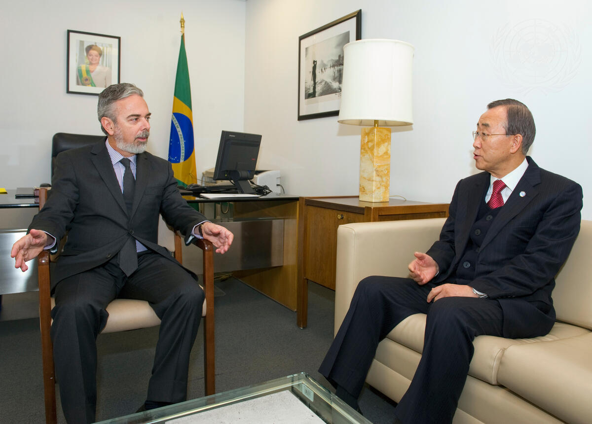 Secretary-General Ban Ki-moon (right) meets with Antonio de Aguiar Patriota, Minister for Foreign Affairs of Brazil, before the Security Council’s open debate on “interdependence between security and development”, chaired by Mr. de Aguiar Patriota.