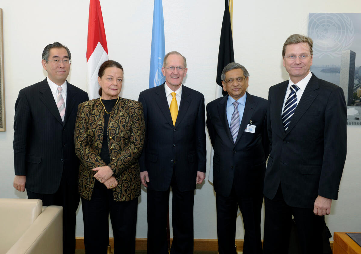 Joseph Deiss (centre), President of the sixty-fifth session of the General Assembly, meets with high-level representatives of the G4 nations, the group seeking permanent seats on the Security Council. From left: Takeaki Matsumoto, Japanese State Secretary for Foreign Affairs; Vera Lúcia Barrouin Crivano Machado, Under Secretary-General for Political Affairs of Brazil; Somanahalli Mallaiah Krishna, Minister for Foreign Affairs of India; and Guido Westerwelle, Minister for Foreign Affairs of Germany.
