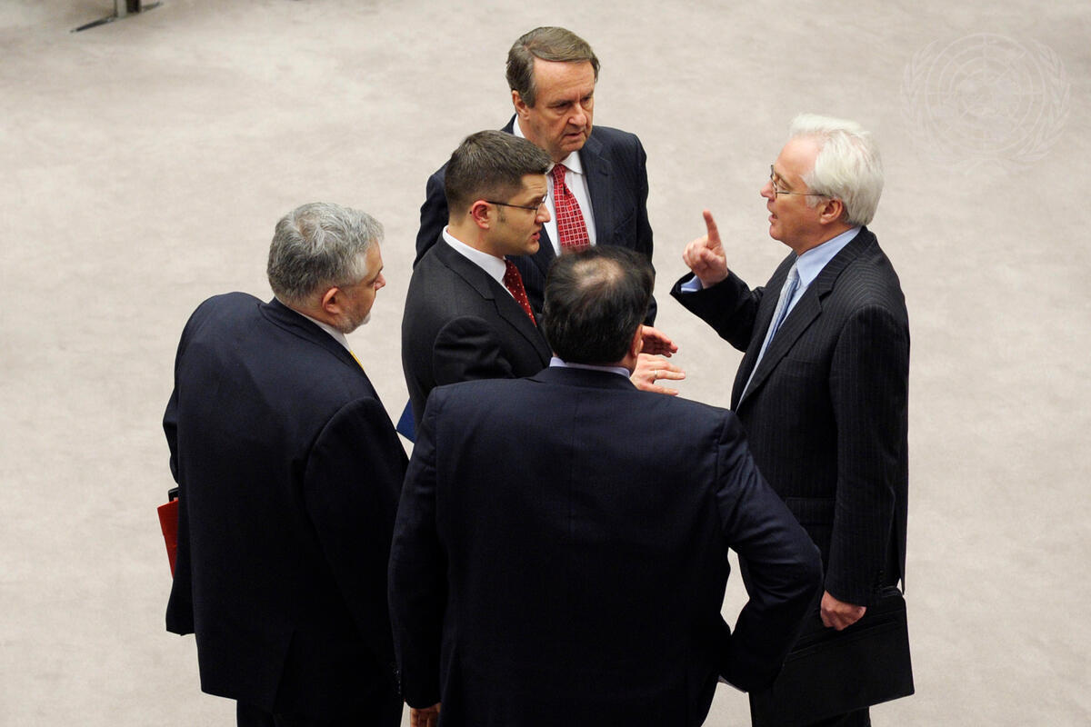 Vitaly I. Churkin (right), Permanent Representative of the Russian Federation to the UN, converses with Serbian Foreign Minister Vuk Jeremic (facing Mr. Churkin) prior to the Security Council’s meeting on developments in Kosovo and Serbia.