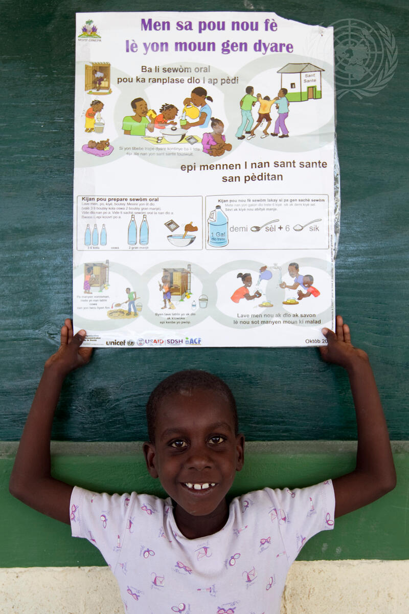 A child holds up a poster with health tips at a free clinic in Port-au-Prince’s impoverished Cité Soleil neighbourhood, where the UN Stabilization Mission in Haiti (MINUSTAH)’s Violence Reduction Section is working with a volunteer association to help disenfranchised women and children.