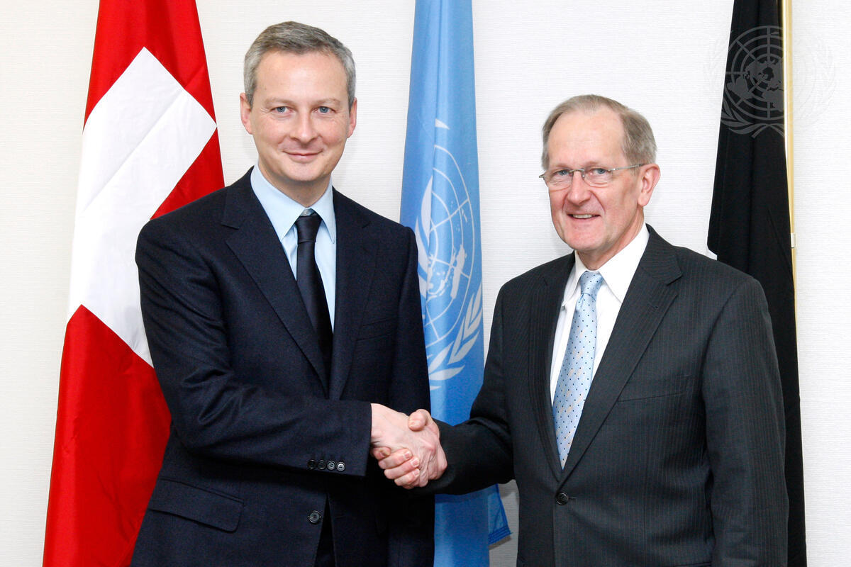Joseph Deiss (right), President of the sixty-fifth session of the General Assembly, meets with Bruno Le Maire, Minister of Agriculture, Food Supply, Fisheries, Rural Areas and Regional Development of France.
