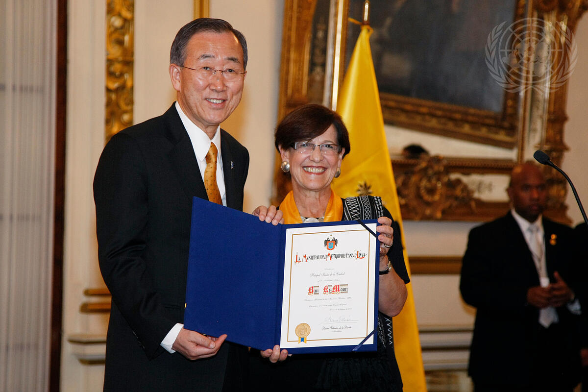 Secretary-General Ban Ki-moon (left) is honoured as an “illustrious guest” in a formal ceremony hosted by Mayor of Lima Susana Villaran (right), at the Municipal Palace, in Lima, Peru.