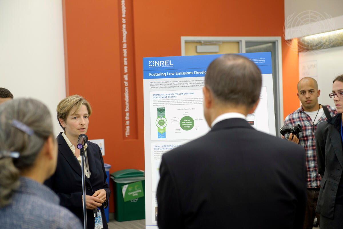 Secretary-General Ban Ki-moon (right, back to camera) looks at presentations by international programs staff and researchers of the National Renewable Energy Laboratory (NREL), during his tour of the NREL in Denver, Colorado.