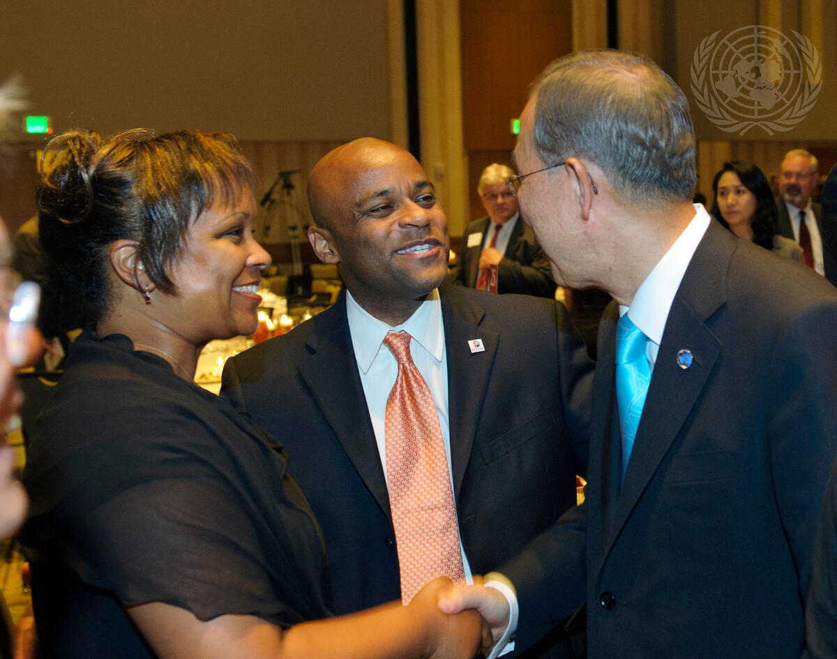 Secretary-General Ban Ki-moon (right) meets with Michael Hancock, Mayor of Denver, Colorado, and Mr. Hancock’s wife, Mary, at the 14th annual Korbel Dinner in Denver. During the dinner Mr. Ban accepted the Global Advancement Award from the University of Denver’s Josef Korbel School of International Studies.