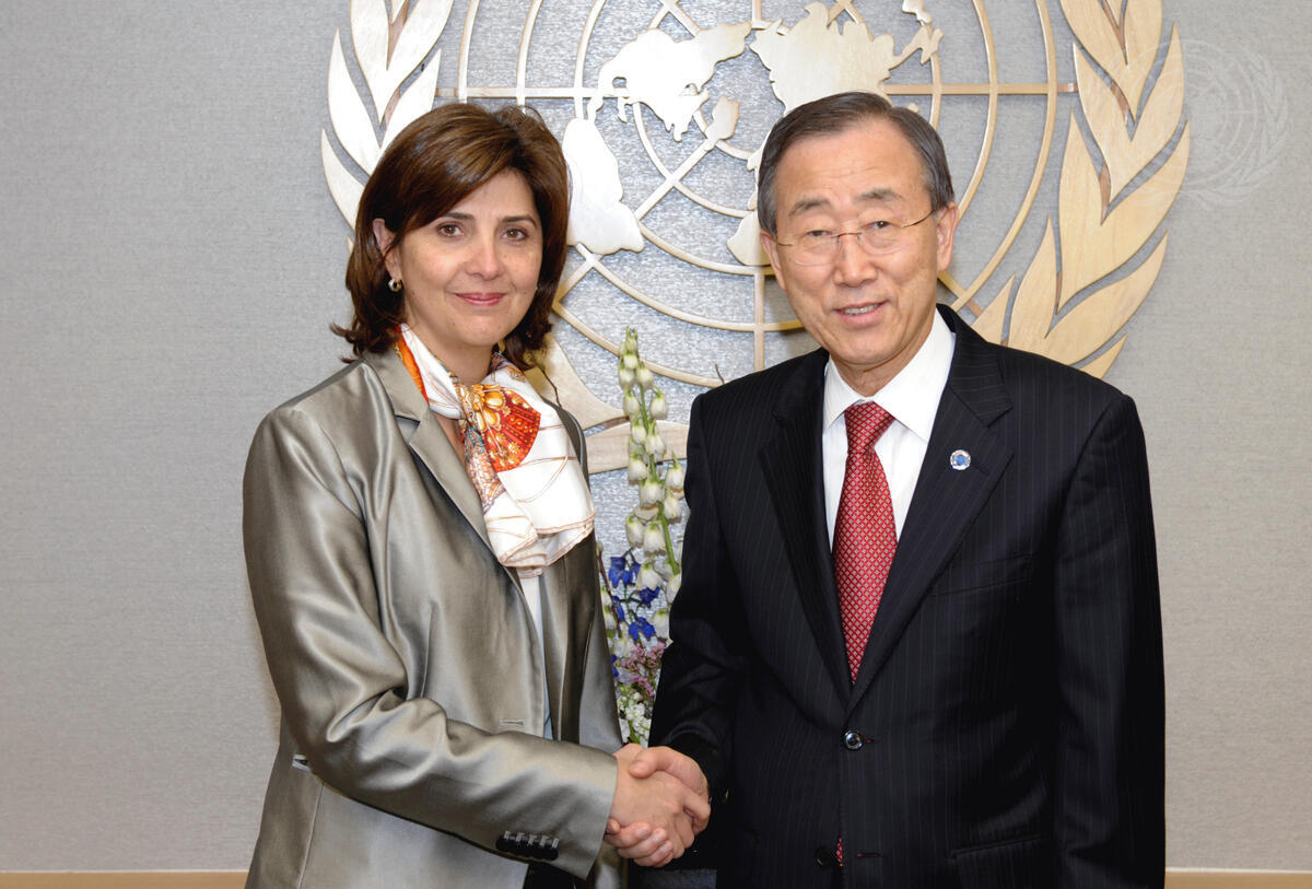Secretary-General Ban Ki-moon (right) meets with Ángela Holguín Cuéllar, Minister for Foreign Affairs of Colombia.