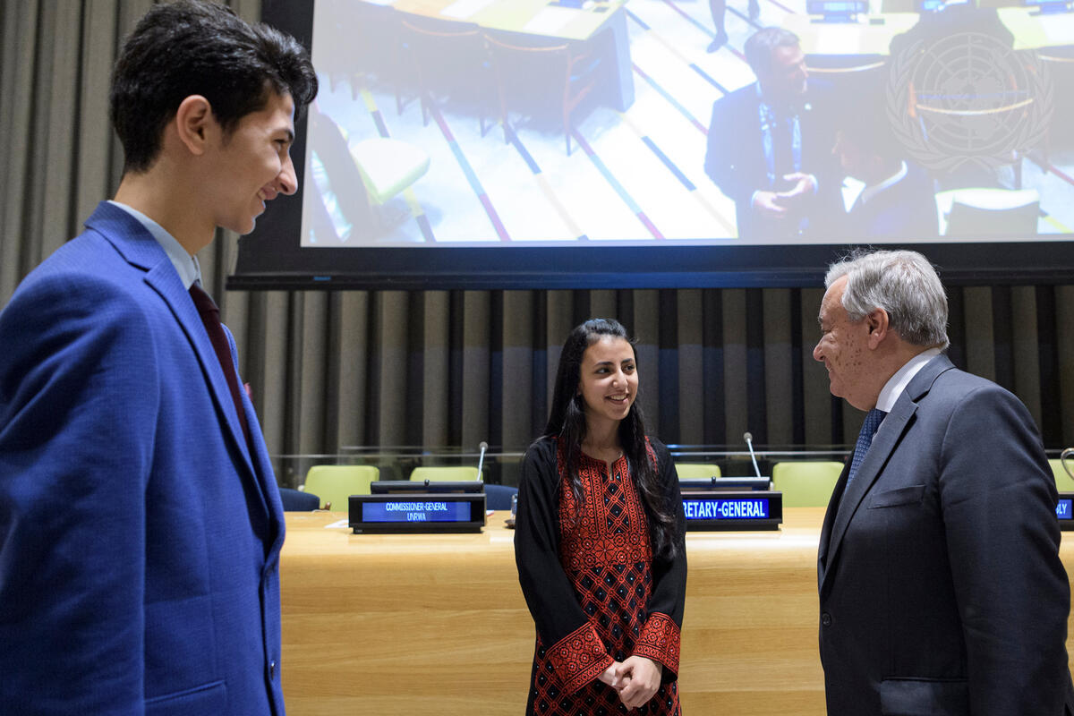 Prior to the meeting, Secretary-General António Guterres (right) spoke with Hanan Abu Sabeh (centre) and Hatem Hamdouna, Student Parliamentarians at UNRWA.