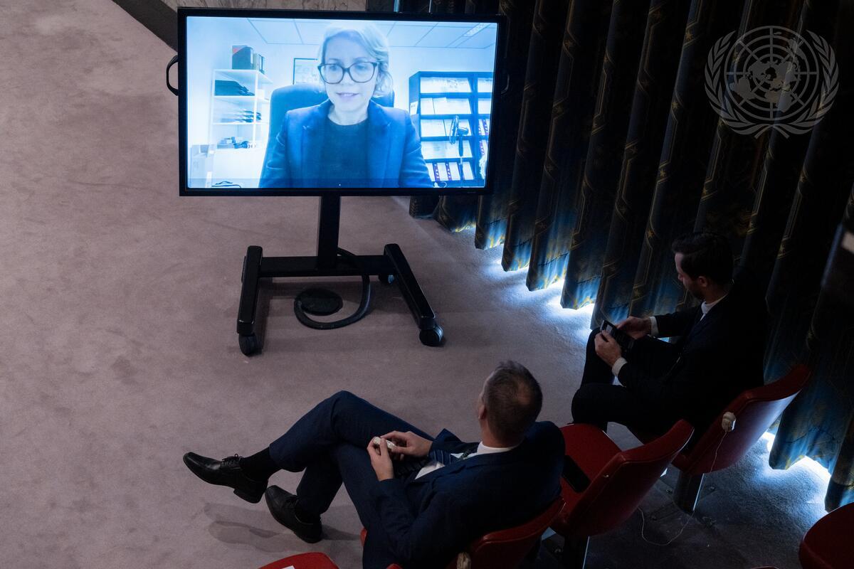 Christelle Hurè (on screen), Regional Head of Advocacy for the Norwegian Refugee Council (NRC), briefs the Security Council meeting on the Central African region. The Council heard a Report of the Secretary-General on the situation in Central Africa and the activities of the United Nations Regional Office for Central Africa.