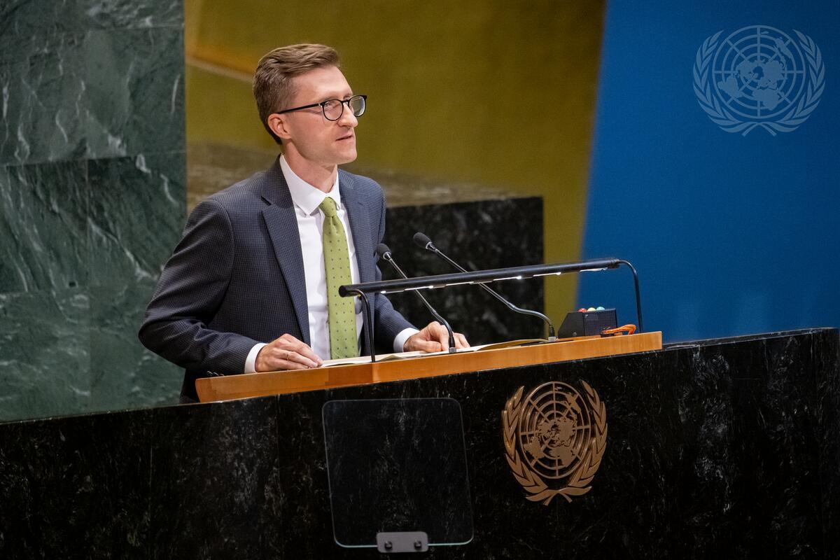 Artsiom Tozik, Senior Counsellor at the Permanent Mission of the Republic of Belarus to the United Nations, introduces a draft resolution on the "Persistent legacy of the Chernobyl disaster" during the 59th plenary meeting of the General Assembly. The Assembly debated a number of issues on the agenda, among them strengthening of the coordination of humanitarian and disaster relief assistance of the United Nations, including special economic assistance and strengthening of the coordination of emergency humanitarian assistance of the United Nations.