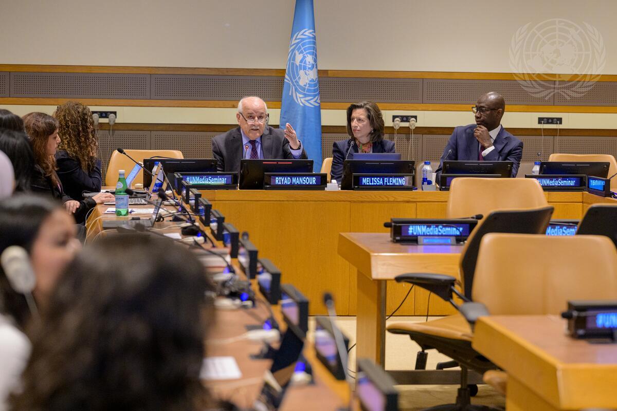 Riyad Mansour (third from right facing camera), Permanent Observer of the State of Palestine to the United Nations, speaks during the 2025 United Nations International Media Seminar on Peace in Middle East: Breaking Barriers: Navigating the Dangers and Complexities of Reporting from Gaza and the West Bank. At second from right is Melissa Fleming, Under-Secretary-General for Global Communications, and at right is Coly Seck, Chair of the Committee on the Exercise of the Inalienable Rights of the Palestinian People (CEIRPP).