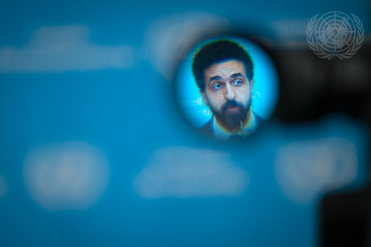 Ibrahim Olabi (in viewfinder), Permanent Representative of the Syrian Arab Republic to the United Nations, briefs reporters at UN Headquarters.