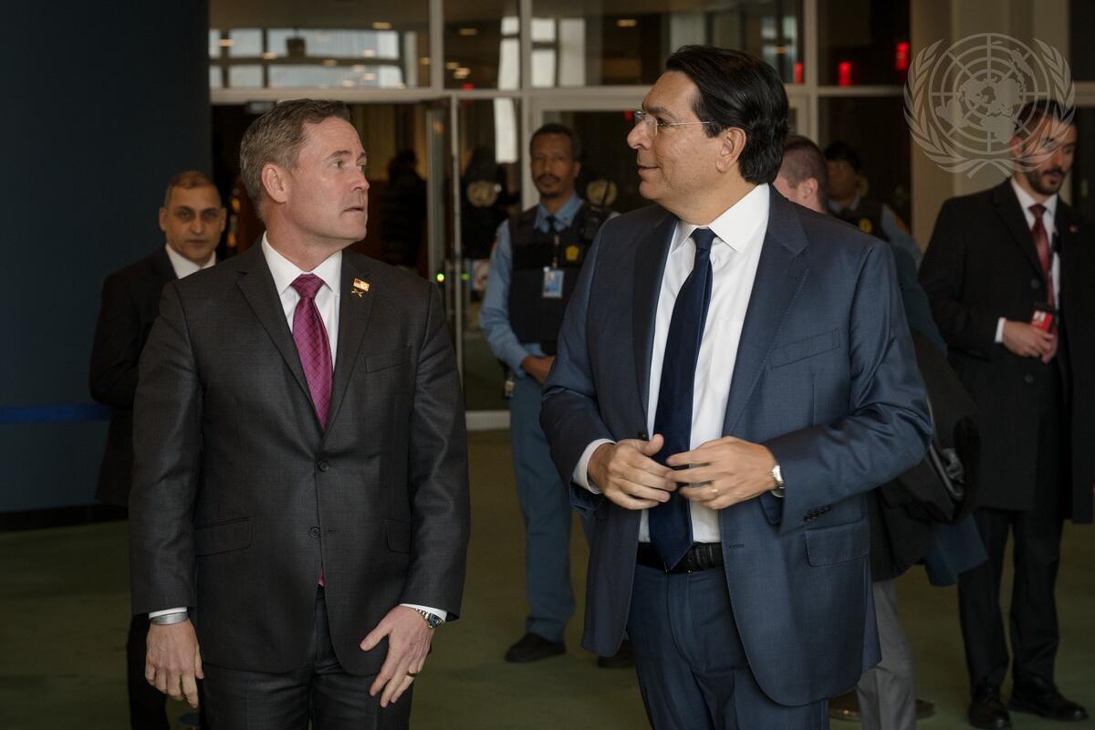 Danny Danon (right), Permanent Representative of Israel to the United Nations, speaks with Michael G. Waltz, Permanent Representative of the United States of America to the United Nations, at UN Headquarters during the United Nations Observance of International Day of Commemoration in memory of the victims of the Holocaust on the theme "Holocaust Remembrance for Dignity and Human Rights".